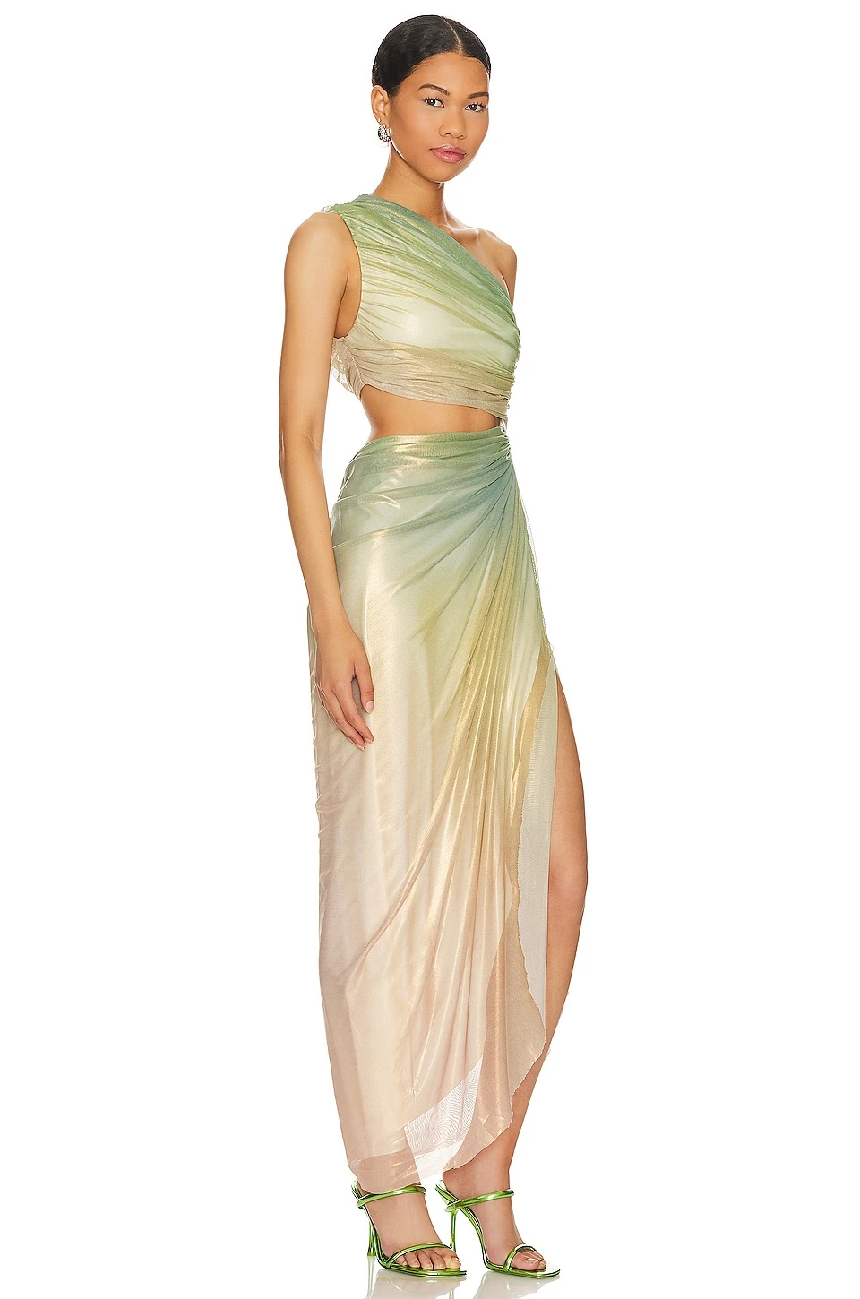 - Ombre mesh overlay with metallic gold threading with ruched sides