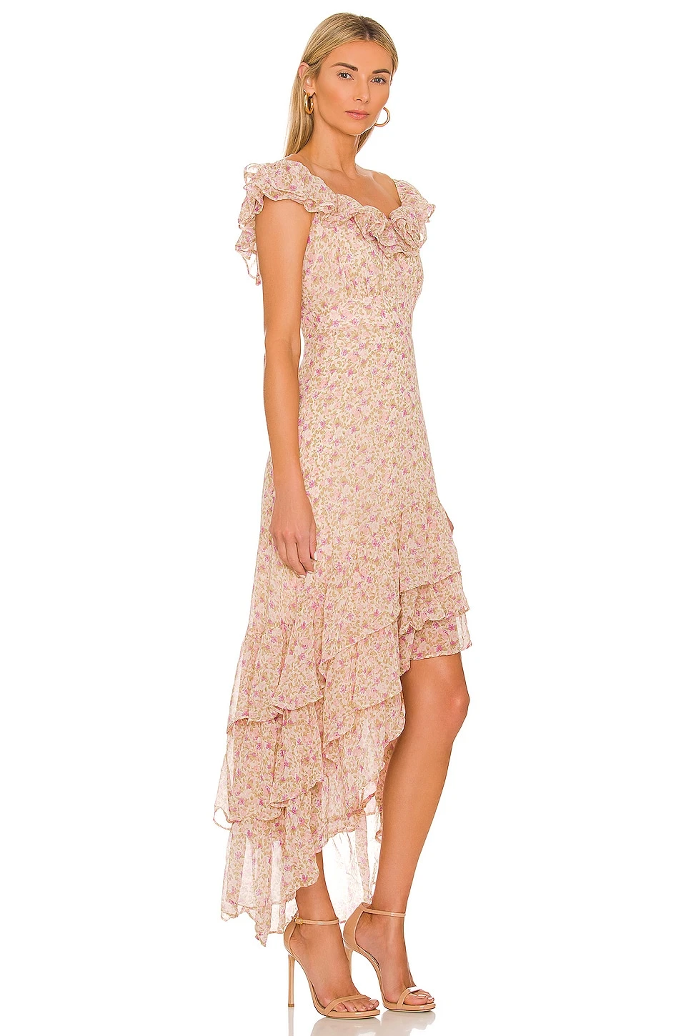 - Lightweight chiffon fabric with cascading ruffle detail