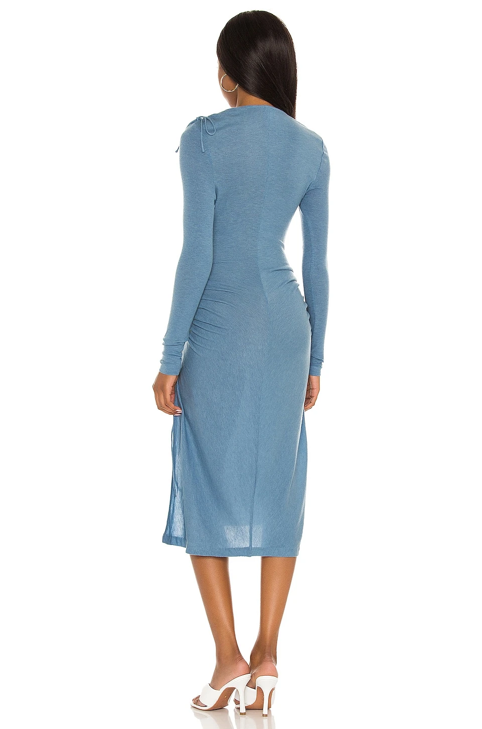- Ruched drawstring hips with side seam slits