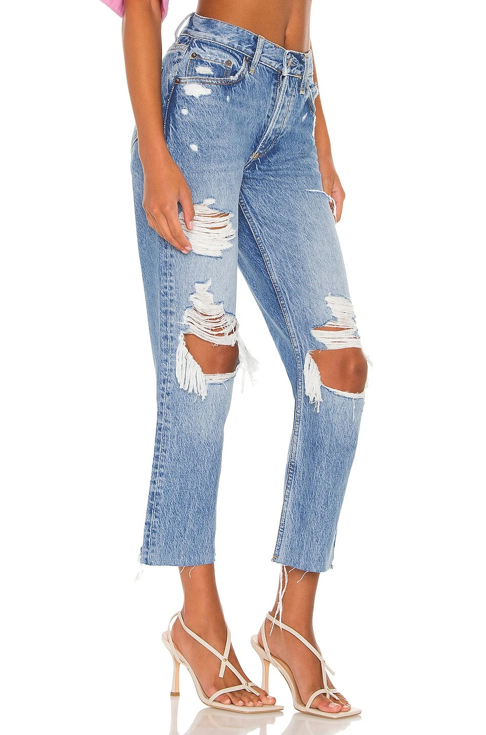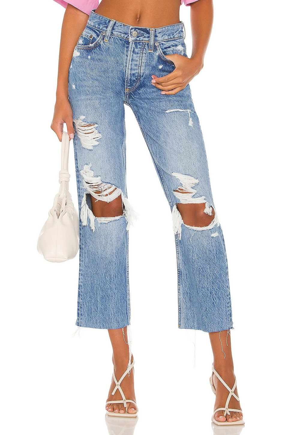 Frayed hem - 14″ at the knee narrows to 13″ at the leg opening