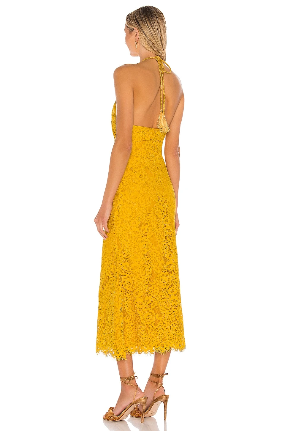 Self: 38% cotton, 35% polyamide, 27% viscose.Lining: 100% poly. Hand wash cold. Fully lined. Hidden side zipper closure. Halterneck with tie closure and tassel accents. Lace overlay. Imported. Revolve Style No. HOOF-WD671. Manufacturer Style No. HHD668 S20.